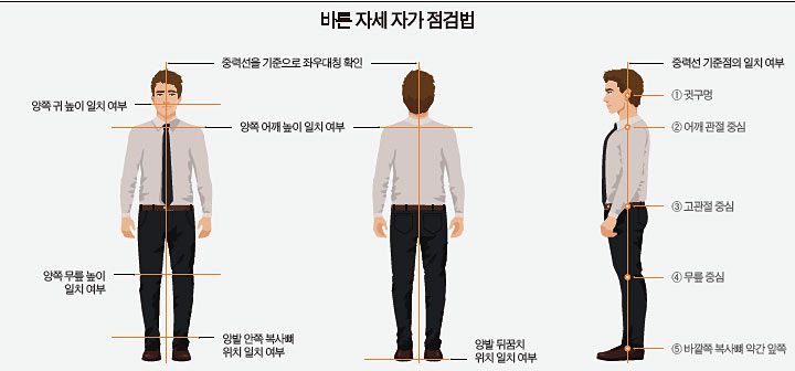 - 서는 자세: 어깨를 펴고 턱을 살짝 당기며 복근에 힘을 주어 몸통을 곧게 세웁니다. 한쪽 다리에만 체중을 싣거나, 짝다리를 짚는 습관은 피합니다.