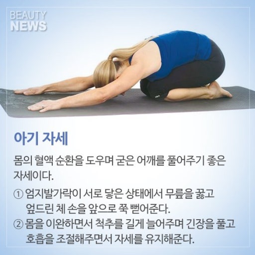 - 자세: 무릎을 꿇고 앉아 엉덩이를 발뒤꿈치에 댑니다. 상체를 앞으로 숙여 이마를 바닥에 대고 팔을 앞으로 쭉 뻗습니다.