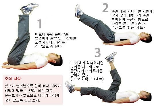 - 동작: 복근의 힘으로 다리를 천천히 들어 올립니다 (바닥에서 90도까지). 허리가 바닥에서 뜨지 않도록 주의하며, 다시 천천히 다리를 내립니다. 이때 다리가 완전히 바닥에 닿기 직전에 멈추는 것이 복근에 더 많은 자극을 줍니다.