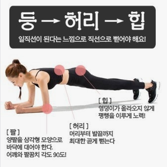 - 자세: 팔꿈치를 어깨너비로 벌려 바닥에 대고, 몸을 일직선으로 유지합니다. 발은 모아 발끝으로 바닥을 지지합니다. 복근과 엉덩이에 힘을 주어 허리가 꺾이거나 솟아오르지 않도록 주의합니다.