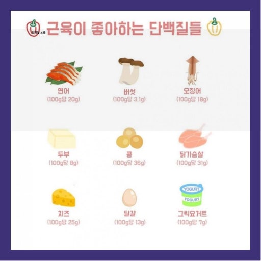 - 닭가슴살, 살코기, 생선, 두부, 콩, 계란 : 소화하기 쉬운 형태로 섭취하는 것이 좋습니다.