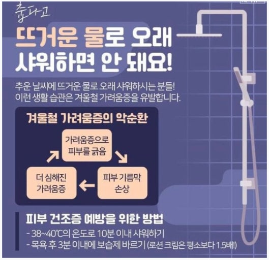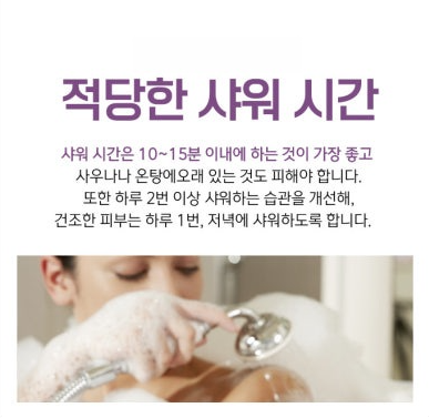 - **샤워 시간 단축:** 샤워 시간은 **10~15분 이내**로 짧게 하는 것이 좋습니다. 특히 건조한 피부라면 5~10분 내외로 줄이는 것이 중요합니다.