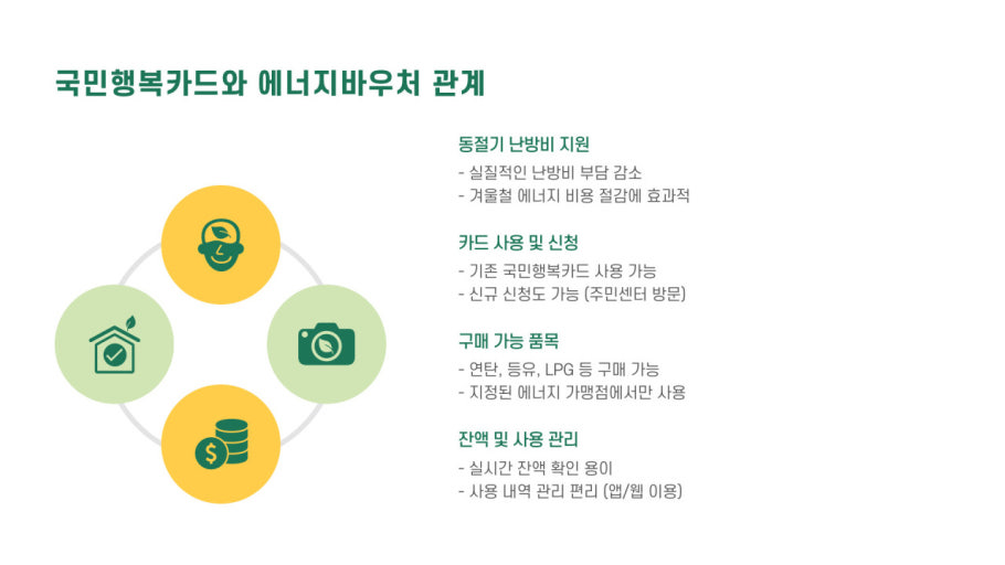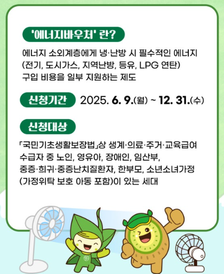 - 사용처: 전기, 도시가스, 지역난방 요금 고지서에서 바우처 금액만큼 자동 차감됩니다.