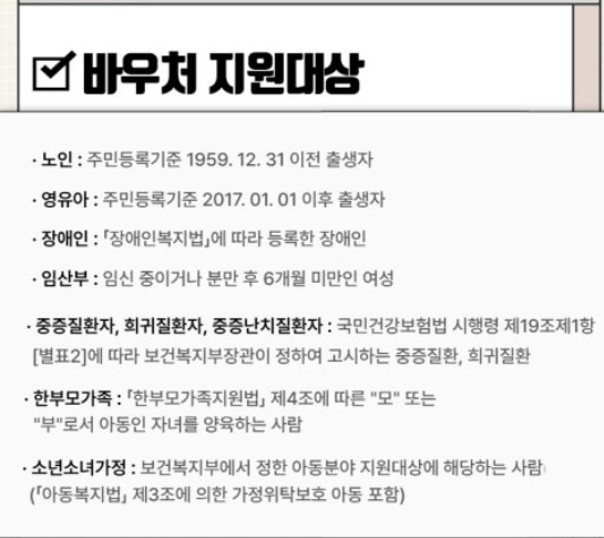 - 임산부: 임신 중이거나 분만 후 6개월 미만인 여성 (산모 수첩 또는 임신/출산 확인서)