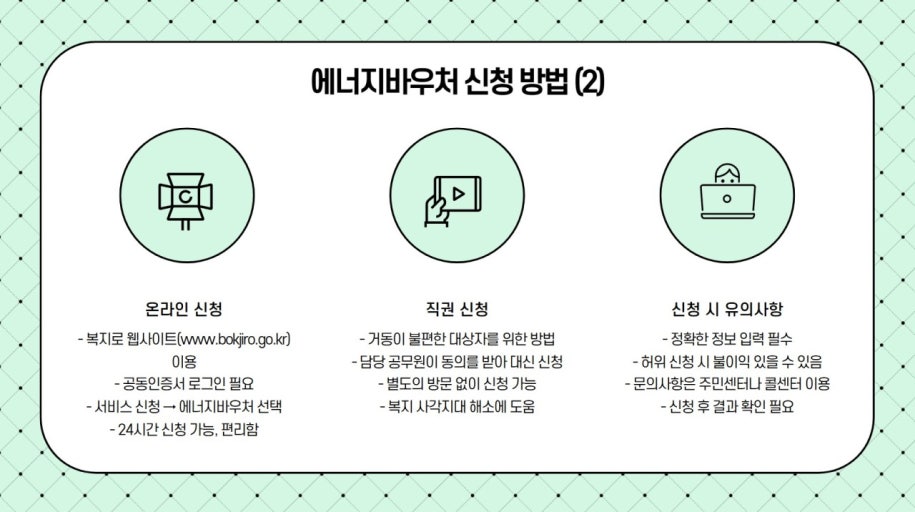 - 에너지바우처 신청: 복지로 사이트 내 '서비스 신청' → '복지서비스 신청' → '에너지바우처' 메뉴에서 온라인으로 신청서를 작성하고 필요한 서류를 첨부합니다.