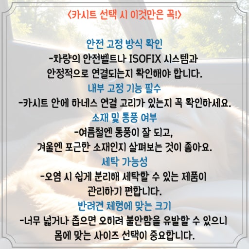 강아지 카시트를 선택할 때는 몇 가지 중요한 요소를 고려해야 합니다.