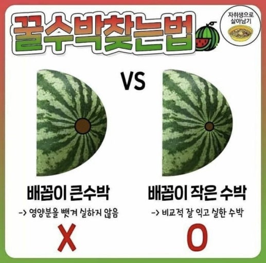 - 크고 넓적한 배꼽: 아직 덜 익었거나 과육이 무를 수 있습니다. 큰 배꼽은 수박이 성장기에 수분을 과하게 흡수했거나, 미처 영양분을 충분히 저장하지 못했을 때 나타나는 경향이 있습니다.
