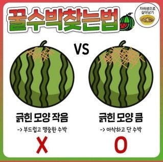 - 갓 수확한 싱싱한 수박: 꼭지가 초록색을 띠고 꼬불꼬불하게 말려있는 것이 좋습니다. 마치 돼지꼬리처럼 말려있는 모양이 잘 익은 수박의 특징으로, 수확 후에도 수박이 스트레스를 덜 받았다는 의미로 해석됩니다.