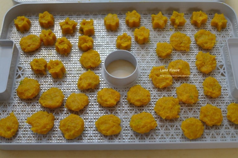 - 식품 건조기를 이용해 70°C에서 6~8시간 건조하거나, 100°C로 예열된 오븐에 1시간 정도 구워 수분을 날려줍니다. (말랑한 식감을 원하면 건조 시간을 줄여주세요.)