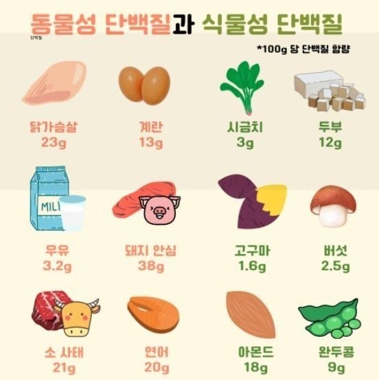 - 하루 권장량: 자신의 체중(kg)당 0.91g 이상의 단백질을 섭취하세요. (예: 70kg 성인 = 약 64g)