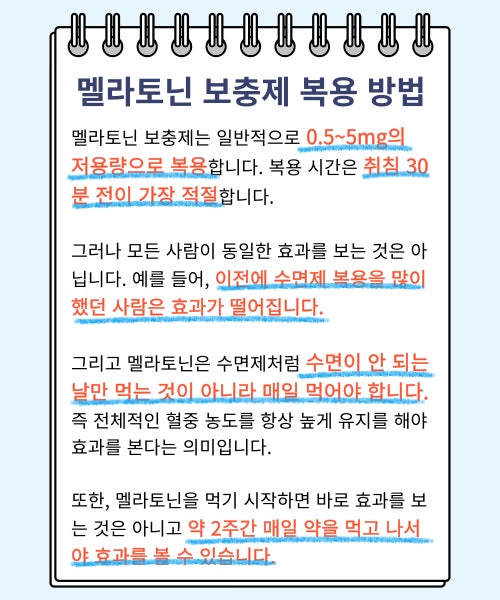 - 멜라토닌 보충제는 수면제가 아닙니다. 수면제처럼 직접적으로 중추신경계를 억제하여 강제로 잠을 재우는 것이 아니라, 몸의 생체 시계를 조절하여 자연스러운 수면을 유도하는 보조제입니다.