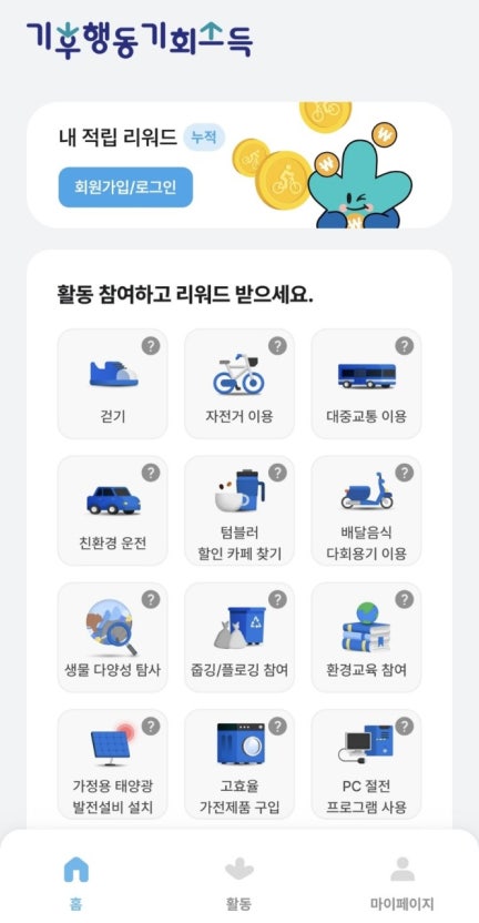 - **실천 활동 연계:** 걷기, 자전거, 대중교통 등 리워드를 받고 싶은 활동 항목에 대해 앱과 데이터 연동(예: 교통카드, T맵, 건강 앱 등)을 신청합니다.