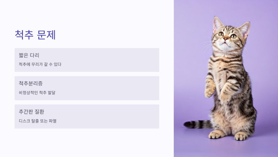 - 원인: 짧은 다리로 인해 척추에 가해지는 부담이 크고, 연골 이형성증 유전자의 영향으로 척추뼈의 변형 가능성이 높습니다. 특히 먼치킨끼리의 교배(MM 유전자) 시 발생 확률이 매우 높아집니다.