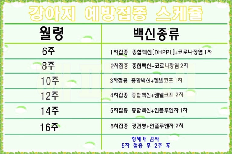- 광견병: 법적으로 의무화된 백신으로, 1년에 한 번씩 접종해야 합니다.