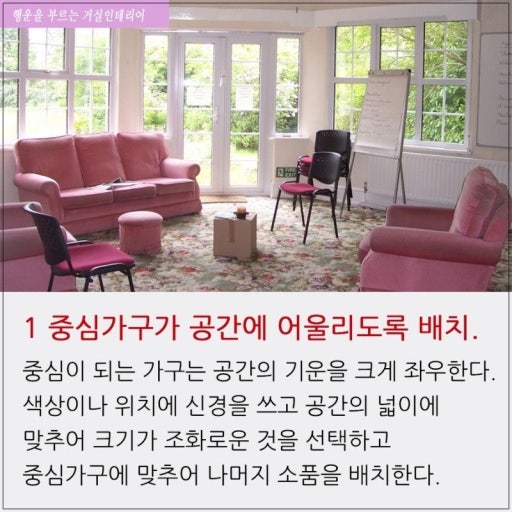 - 소파: 소파는 벽에 붙여 안정감을 주고, 너무 크거나 답답한 가구는 피합니다.