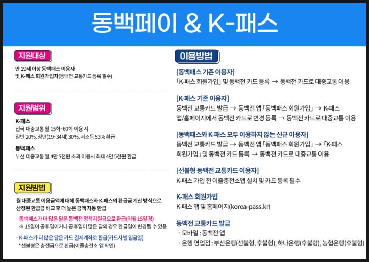 - 동백전과의 연계: 동백전 교통카드를 K-패스 카드로 등록하면, 동백전 자체 캐시백 혜택과 별개로 K-패스 환급 혜택을 동시에 받을 수 있습니다.