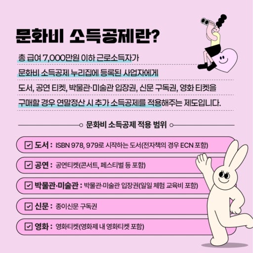 문화비 소득공제는 단순한 절세를 넘어, 국민들의 문화생활을 독려하고 문화 산업을 활성화하는 의미 있는 제도입니다. 비록 공제율이나 한도가 크지 않다고 느껴질 수 있지만, 작은 금액이라도 놓치지 않고 챙긴다면 **'13월의 보너스'**를 받는 데 큰 도움이 될 것입니다.