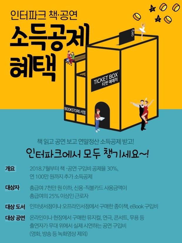- 대상: 연극, 뮤지컬, 콘서트, 오페라, 발레, 무용, 클래식, 국악 등 **공연**을 관람하기 위해 구입한 티켓.