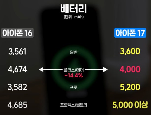 - 현재 프로 모델에만 적용되는 가변 주사율(ProMotion)과 상시표시형 디스플레이(Always-On Display) 기능이 아이폰 17 일반 모델에도 적용될 수 있다는 루머가 있습니다. 이는 일반 모델 사용자들의 만족도를 크게 높일 것입니다.