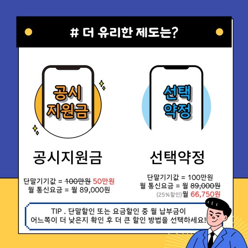"새로운 스마트폰으로 바꾸고 싶은데, 공시지원금이 뭔지 선택약정은 또 뭔지 너무 헷갈려요.", "어떤 할인이 나한테 더 유리한지 모르겠어요. 최신폰은 할인도 별로 없겠죠?", "지금 쓰고 있는 폰 약정이 끝났는데, 그냥 재약정해도 될까요?"