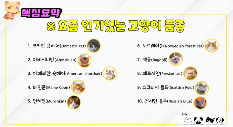 - 가족과의 궁합: 아이나 다른 반려동물이 있는 경우, 사교성이 좋은 품종(랙돌, 메인쿤)을 고려하는 것이 좋습니다.