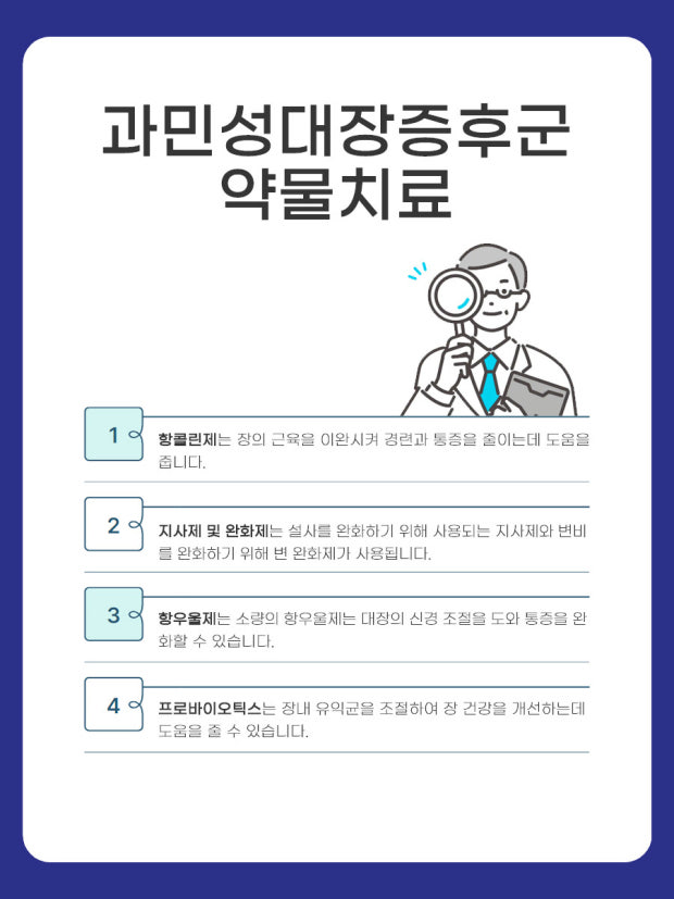 - 항우울제: 장의 신경계를 조절하고 통증 역치를 높여 증상을 완화하는 데 도움을 줄 수 있습니다. (낮은 용량으로 처방)