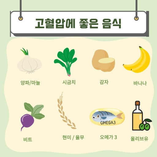 - 칼슘: 혈압 조절에 관여합니다. (우유, 요구르트, 뼈째 먹는 생선)