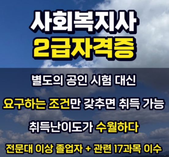 - 응시 자격: 전문대학 졸업 이상 학력 + 사회복지 관련 과목 이수(17과목) + 사회복지 현장 실습(160시간 이상)