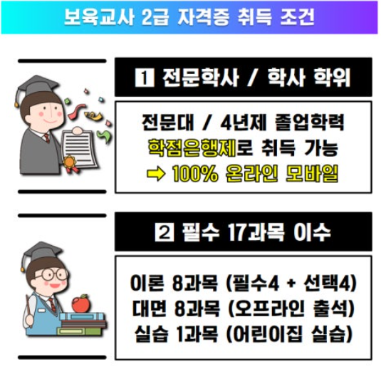 - 학습 전략: 사회복지사 2급과 마찬가지로 학점은행제를 통해 온라인 강의 이수가 가능합니다. 실습은 보육 기관에서 진행됩니다.