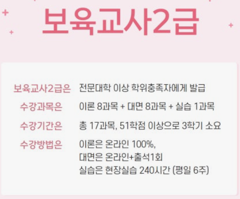- 응시 자격: 전문대학 졸업 이상 학력 + 보육 관련 과목 이수(17과목) + 보육실습(240시간 이상)