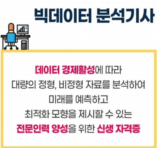 - 자격증 개요: 대량의 데이터를 수집, 저장, 처리, 분석하여 유의미한 정보를 도출하고 시각화하는 전문 역량을 검증하는 국가기술자격증입니다. 데이터 기반 의사결정이 중요해지면서 각광받고 있습니다.