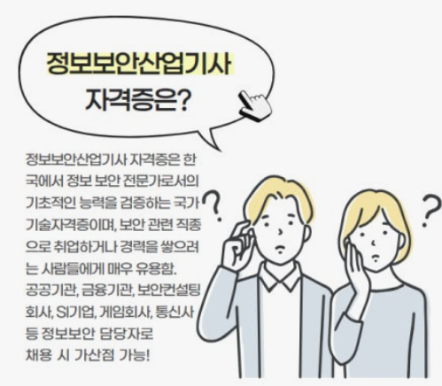 - 시험 과목: 필기(시스템 보안, 네트워크 보안, 애플리케이션 보안, 정보보안 일반, 정보보안 관리 및 법규), 실기(정보보안 실무)