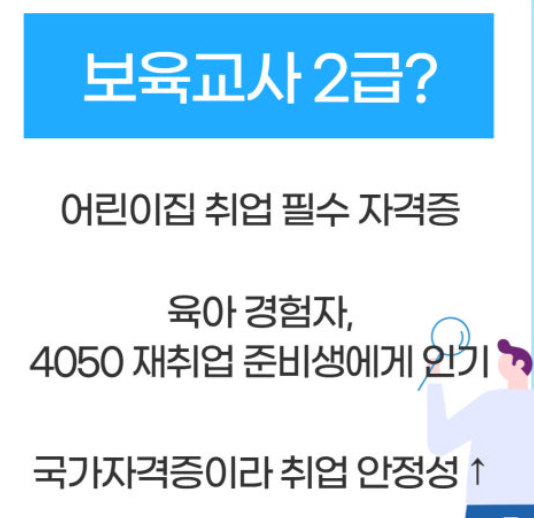 - 자격증 개요: 영유아의 보육, 교육, 보호를 담당하는 전문가 자격입니다. 맞벌이 가구 증가와 보육의 질 향상 요구로 꾸준한 수요가 있습니다.