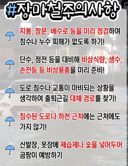 미리미리 준비하고, 기상청의 최신 정보를 꾸준히 확인하면서 슬기롭게 장마철을 이겨내시길 바랍니다!